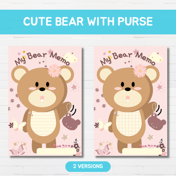 This item is a digital printable memo pads with cute bear with purse design. We have created two versions and available in 5 different [Pink, Blue, Purple, Green, Orange] colors.